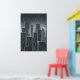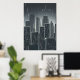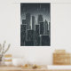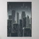 Svart och vit konst av en stad med många skyscraper på natten medan den regnar. Det här är en AI-skapad konst.