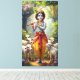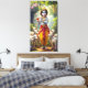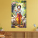 En sjudande målning som skildrar Lord Krishna, Hindu gudom, som en ung pojke som spelar sin flöjt mitt i en lush grönt ängsmark med betande får.