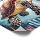En akvarellillustration av en havssköldpadda som simmar graciöst under vattnet. Sköldpaddan har ett väderbitet skal och simmar genom klart blått vatten. Det finns små fiskar som simmar nära sköldpaddan. Ovanför sköldpaddan är frasen "Vila och känna" skriven i elegant skrivstil. Bakgrunden innehåller koraller och andra havsdjur.