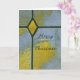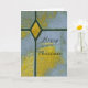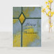 Min bild visar glasmålning. Färgerna är blå och gula . Ert meddelande kan vara gratulationer, God Jul, födelsedag eller en inbjudan. Den diamantformade formen och de svarta linjerna påminner mig om ett kristet kors över hela världen. Lägg till ditt eget speciella meddelande.