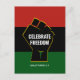 Snyggt kristet JUNETEENTH FIRA FRÅNHET postkort, som visar motivet svart kraftnäve med en gul dropp skugga, mot röd, svart och grön paneler (färgerna på PANAFRIKANSKA FLAGGAN). Huvudtexten på detta Juneteenth-kort säger FIRA FRÅNHET och är baserad på Bibelns skriftställe från Galaterbrevet 5:1 - DET VAR FÖR FRÅNHET Kristus har frigjort oss. Båda texterna är ANPASSNINGSBARA så att du kan ersätta texten med ditt namn eller annan önskad formulering. Detta Juneteenth-kort skulle vara en idealisk hälsning för Juneteenth och under hela året, särskilt på afroamerikanska karibiska firanden och evenemang för svart kulturell medvetenhet.