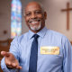 En himmelsk landskapsbild för din kyrkoförsamling Namnskylt för pastor, präst, diakon och annan prästerskap. Den är designad med en vacker pastell orange himmel, fluffiga moln och solstrålar. #Kristen #Katolsk