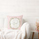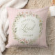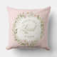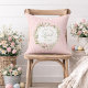 Denna kudde har en krans av rosa blommor på en bakgrund med rosa ränder och texten "Kristus Herren är Uppstånden".