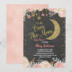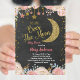 Över månen Baby Shower inbjudan för flicka med en måne, stjärnor och vacker falsk guldglitter.