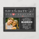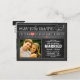 Krita tavlan Kalender Foto Spara Datum Kort - har en krita tavla bakgrund, vintage text och moderna element. Designen har ett krita hjärta för att mata in brud och brudgummens initialer. Spara datum korten har också en kalender som du kan anpassa hjärtan till din egen månad och datum. Slutligen har vykortet också en demo som du kan ändra till ditt eget foto.
