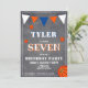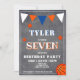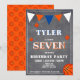 Modern Krita Basketfödelsedagsinbjudan för barn. Söt basketfödelsedagskort. Designen har basebollar och vimplar i orange, vit och blå färger på en kritbakgrund. Anpassa denna födelsedagsinbjudan med ett barns namn, ålder och anpassa all data på inbjudan. Bra som födelsedagsinbjudan för en pojke som älskar basket eller andra sporter.