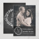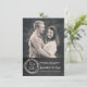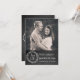 Rolig rusticitet krittavla utseende bröllop spara datumet anmälan, med anpassad bild längst upp på kortet, och en kol grå svart tavla utseende, längst ner. Grafik av en krans med texten Spara datumet, prydar botten. Anpassad vit text är redo att anpassas med din bild och information. Härlig sätt att meddela ditt kommande bröllop.