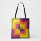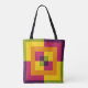 Den här bilden är en geometrisk abstrakt design med koncentriskt kvadratiskt lagrar som spiral inåt. Kvadterna består av fet och kontrasterande färg: gult, orange, rött, oliv grönt och djup lila. Varje kvadrant alternerar i färg och ge utformningen av en dynamisk och nästan optisk illusionsliknande effekt. Kombinationen av varma toner och coolor skapar djup och balans.
