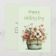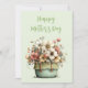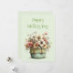 Mors dag-kort med en fantasifull kruka med blommor i stil. Gröna, rosa och krämfärgade nyanser. Ställd i en grön kruka med en rutig duk. Shabby vintagekänsla.