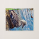 Ett fotografi av en kvinnlig gräsand som står i det grunda området av en damm, med vattenskrivar som rör sig bort från henne i en cirkulär rörelse.