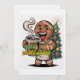 En glad, tecknad pepparkaksman med ett brett, entusiastiskt leende och rosiga kinder. Han bär en enkel vit förkläde och håller upp en klar mugg fylld med mörkt, ångande kaffe, med en framträdande plym av ånga som ringlar sig uppåt. Texten "Spicy and Caffeinated" är kreativt integrerad på kaffemuggen i en djärv, livfull, flerfärgad stil, med subtila stjärn- och flingdekoreringar. I bakgrunden står en minimalistisk men festlig grön julgran prydd med röda och gyllene kulor, krönt med en stjärna, och utstrålar svaga gula ljusstrålar. Den övergripande stilen är ren, glad och grafiskt stark, med tydliga konturer.
