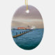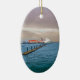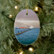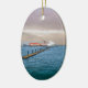 Oval prydnad som presenterar en kryssningfrakt vid pir på Penang, Malaysia. Kryssningfrakten är på blått bevattnar med mulna mörka himmlar.
