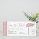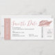 Den vackra frakten för faux-folie i ro guld och handflatan träd på ett modernt minimalistiskt boardingkort sparar det datum som ser ut som ett flygplan rosa, biljett för en designad på en bröllop på en målbröllop för frakt. Gästgäster kärlek som tar emot dessa roligt bröllop-datummeddelanden som innehåller reseuppgifter på baksidan så att de kan börja planera sin resa.