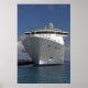 En fotografisk bild av en vit lyxkryssning i färg som är dockad mot ett tydligt blå himmel och en frakt i Västindien som är en havsvik vatten