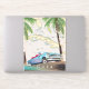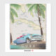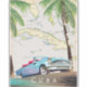 Illustrerad Kuba karta (plus omgivande öar) i en vacker vintage i stil med en klassisk gammal kubanbil i solnedgången.