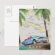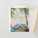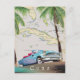 Illustrerad Kuba karta (plus omgivande öar) i en vacker vintage i stil med en klassisk gammal kubanbil i solnedgången.