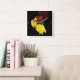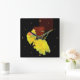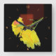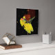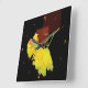Gula blommor på en svart bakgrund med röda kubbar som sveper undan i avstånd