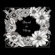 En svart-vit illustration visar en blommig ram runt namnen "David & Mary". Ramen består av olika blommor och lövverk, inklusive prästkragar och andra blomningar med invecklad blad- och blomdetalj. Blommorna är arrangerade i ett cirkulärt mönster och skapar en kransliknande effekt runt namnen. Namnen "David & Mary" är skrivna med en elegant, kursiv stil, centrerade inom den blomstergivna ramen. Bakgrunden är enfärgat svart, vilket får den vita blomsterliknande ramen och texten att sticka ut. Illustrationen är innesluten i en fyrkantig ram, vilket lägger till ett geometriskt element till designen. Illustrationens stil är detaljerad och exakt, liknar en penn- och bläckteckning.