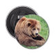 Stora, udda och innehåll bruna björn som ljuger i gräset tittar i kameran.