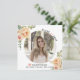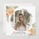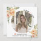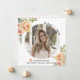 Peach-blommor Class of 2025 studenten fotoannonsering. En fin design som visar ett foto, korallpersikor på översta lämnat hörnet och högerna grund, texten "Klass 2025" i svart och persikofärgad och en studentmössa. Baksidan innehåller en polka punkt mönster i persikor och vitt.
