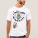 T-shirt-designen har en levande blommigt-klippbild i mitten. Blomman kan vara en daisy, solros, ro eller vilken blomma som helst som betyder tillväxt och godhet. Omgivande av blomman är en lekfull gräns som består av olika fågelklippskonst som är vänd inåt, skapar en känsla av gemenskap och tillsammans. Under blomman sitter texten "Cultivate Kindness" i ett vänligt, flerfärgat teckensnitt. Varje ord skulle kunna vara ett annat färg för att ytterligare betona budskapet om delaktighet och positiv särbehandling.