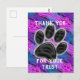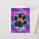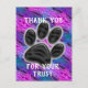 Oavsett om du är veterinär, groomer eller hundpromenad, marknadsför ditt företag med ett prisvärt vykort. Detta kunduppskattningskort har ett stort svart fotavtryck mot en diagonal randig bakgrund i blått och lila. "Tack för ditt förtroende" kan snabbt och enkelt anpassas om du önskar.