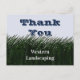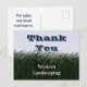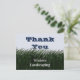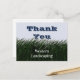 Uttryck din uppskattning till dina lojala kunder med detta prisvärda reklambrevskort. Kortet har målad mörkgrön gräsmatta och en ljusblå "himmel". "Tack" tittar ut bakom grässtrån. Ert företagsnamn visas i en professionell vit typsnitt mot den gröna landskapsplaneringen. Baksidan av kortet ger gott om utrymme för ytterligare ord av uppskattning som kan anpassas för att passa era affärsbehov.
