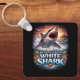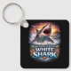 En vild vit haj bryter fram genom vågorna vid solnedgång, käkarna vidöppna medan havsfåglar svävar över den glödande havsytan.