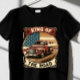 Här är en rustisk T-shirt vintage-stil med en klassisk lastbil på 1950-talet som kör en öppen motorväg med en åldras amerikansk flagga och frasen "Kung på vägen" 🚛 🇺 ✨ 🇸.