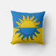 "Per fess azure och eller, en sol, förändrad." Populace-bricka för Konungariket Atenveldt (SCA). Baksidan av kudden är ett medeltida mönster i samordningen av färg.