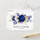 Elegant kunglig blå guld tema vigsel spara datum vykort med elegant bukett av kunglig blå, marinblå, guld, gul färg rosblommor knoppar och eukalyptusblad. Vänligen kontakta mig för hjälp med anpassning eller om du behöver någon annan produkt med denna design.