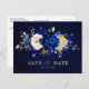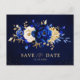 Elegant kunglig blå guld tema bröllop spara datum vykort med elegant bukett av kunglig blå, marinblå, guld, gul färg rosblommor knoppar och eucalyptusblad. Vänligen kontakta mig för hjälp med anpassning eller om du behöver någon annan produkt med denna design.