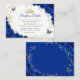 Kunglig blå, guld och vit blomsterinspirerad Quinceanera mottagningsdetaljkort. Funktioner, script-teckensnitt, guldfjärilar, akvarellrosor och krona. Perfekt för en elegant prinsessglam-celebration. Personifiera med dina egna detaljer.