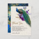 Elegant bröllopsfest tackkort med en magnifik påfågel med vackra blommor. Vänd på kortet för att se en rustik decoupagekonst på baksidan av kortet.