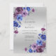 Denna design har en sofistikerad palett av kunglig blå, djup plommon och mjuka lavendelvattenfärgblommor mot en silvergradient. Frodiga rosor och ranunculus-kronblad skapar en romantisk och dyster atmosfär. De konstnärligt återgivna blomklustren och det grå bladverket tillför en eterisk och tidlös elegans.