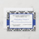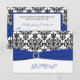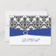 Detta svarta och vita damaskus-svarskort med ett blått UTRYCKT band och juvelprytt spänne matchar bröllopsinbjudan nedan. Om du behöver andra matchande föremål eller vill ha det i en annan färgkombination, vänligen maila niteowlstudio@gmail.com med din förfrågan.