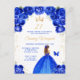 Denna eleganta och glamourösa födelsedagsfestinbjudan har en vacker prinsessa med brunt hår i en kunglig blå balklänning. Texten kombinerar handskriven skrift och moderna sans serif-teckensnitt för en klassisk och sofistikerad look. Blomsterarrangemangen, fjärilen och det gyllene konfettit skapar den perfekta blandningen av rustik och chic.