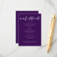 Detta kungliga lila bröllopsevenemangets detaljer-kort har vacker vit typografi på ett solidt djupt violett kort för en kvällsceremoni på vintern. Minimalistisk skrift och en djärv färg får era mottagningskort att sticka ut från mängden.