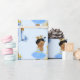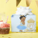 Söt liten prinsessa med sin krona och vagn framför sitt slott. Gjord i babyblått & guld. Använd för födelsedagar, baby shower eller annonser.