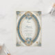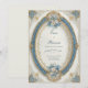 Transponera dina gäster till en värld av historisk storslagenhet och kunglig överdåd med denna magnifika, kungliga viktorianska bröllopsinbjudan. Designen är en hisnande, högdetaljerad illustration centrerad kring en dominerande, dimensionell oval ram. Denna centrala ram är djupt skiktad: en stor, utskuren yttre ring i dammig blå/teal barockstil, som inramar ett ljust, rent, off-white textområde. Invändigt guldornerad rullning och detaljerad lövverk, accentuerad av små gnistrande guldblad, omger vackert och flätas samman med ramen. Bakgrunden är en mycket texturerad vit eller blek krämton med lättare guldaccenter, och hörnen har dämpade blå ornamentala blomsterarrangemang som förstärker den skiktade, antika lyxen. Det inre textområdet är ytterligare prytt med ömtåliga klasar av mjuka vita och rosafärgade rosor och elegant blått lövverk högst upp och längst ned. Det övergripande temat är en av formell elegans och antika lyx, perfekt för par som planerar ett storslaget bollsalsbröllop, en historisk lokal för mottagning eller