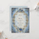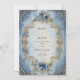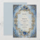 Transponera dina gäster till en värld av absolut kunglig överdåd och historisk storslagenhet med denna magnifika, kungliga, viktorianska bröllopsinbjudan. Designen är en hisnande, högdetaljerad illustration centrerad kring en utsmyckad, skulpterad oval ram. Ramen är gestaltad i skimrande falskt guld eller brons, med invecklad barockrullning, filigran och subtila juvelaccents. Färgpaletten är en vacker, högkontrastblandning: den yttre kanten har en livfull, safirblå bakgrund överlagd med rikt guldglitter och rullande vinrankor, medan det centrala textområdet är en mjuk, lysande blekblå och crèmeton som antyder en lugn himmel. Ramen är ytterligare utsmyckad med dimensionala klasar av vackra blå rosor och små vita och gyllene fyllnadsblommor vid toppen och botten, vilket förstärker den lyxiga, historiska estetiken. Det övergripande temat är en av formell elegans och antikt lyx, perfekt för par som planerar ett formellt bröllop i svart tie, en barockgalafest eller någon annan händelse som betonar rika juveltoner och klassisk storslagenhet. Denna design är perfekt för viktorianska bröllopsinbjudningar, kungliga års