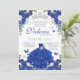 Denna eleganta blomster-quinceanera-inbjudan har fjärilar (du kan flytta eller ta bort dem) och vackra blå och vita blommor som rosor och hortensia och peonior. Det finns en vacker silverdiamanttiara och all text kan anpassas.