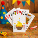 En gult kaka med ljus. Den här designen ser ut att vara effektiv på de här spelkorten