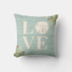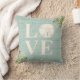 En juldekorativ kudde som ställer ut ord KÄRLEK. Dekorerat med en sanddollar, sätter på land strandgräs, bär och en riden ut wood bakgrund för din jul dekoren.
