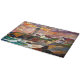 Vacker skärbräda med en charmig kustby med en fyr som övervakar havet vid solnedgång. Den konstnärliga glasmålningstilen tillför värme och elegans till alla kök.