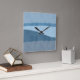 Den här väggklockan har abstrakter av blått och grått som liknar kust- eller bukhorisonter. Perfekt som tillägg till en strand eller ett blått temarum.
