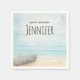 pappra servetter från grattis på födelsedagen med vacker rytm. Diskret färg av ljusblått, sandbrunt och milt vitt. En strandscen med en båt på stranden med ett fiskenät hängande på sidan. En elegant ska se ut.