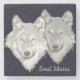 Den stilfulla stenkustfartyget med diagram av ansiktena av två gråa varger, på en mörk - slösa bakgrund. Vittext läser Soulkompisar och kan personifieras för att läsa vad du önskar. Den underbara gåvaidén för några kopplar ihop.