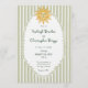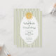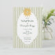 Denna fantasifulla kustbröllopsinbjudan har ett vintage solmotiv, spetskant, palmer och en stilren salvia grön randig bakgrund. Perfekt för ett strand- eller Kalifornien-destinationbröllop. Skapad av Simply Farmhouse Press.