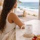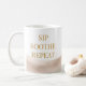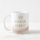 Strandinspirerad neutral design med ett varvande taupe-vattenfärgsskimmer med guldbokstäver som läser Sip Soothe Repeat. Det flytande mönstret passar enkelt ihop med ljusa trädskivor, linne-kök eller kustnära frukostnisch, vilket gör det perfekt för dagliga kafferitualer, långsamma morgnar eller kvällste i en raffinerad strandmiljö.
